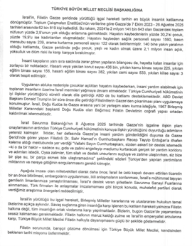 İsrail’in Gazze Şeridi’ne yönelik saldırıları sürerken CHP, DEM Parti, Türkiye İşçi Partisi ve Saadet Partisi, Türkiye Büyük Millet Meclisi (TBMM) Genel Kurulu'nu İsrail'in Gazze'de uyguladığı soykırım dolayısıyla 29 Ağustos Cuma günü saat 14.00’te olağanüstü toplantıya çağırdı.