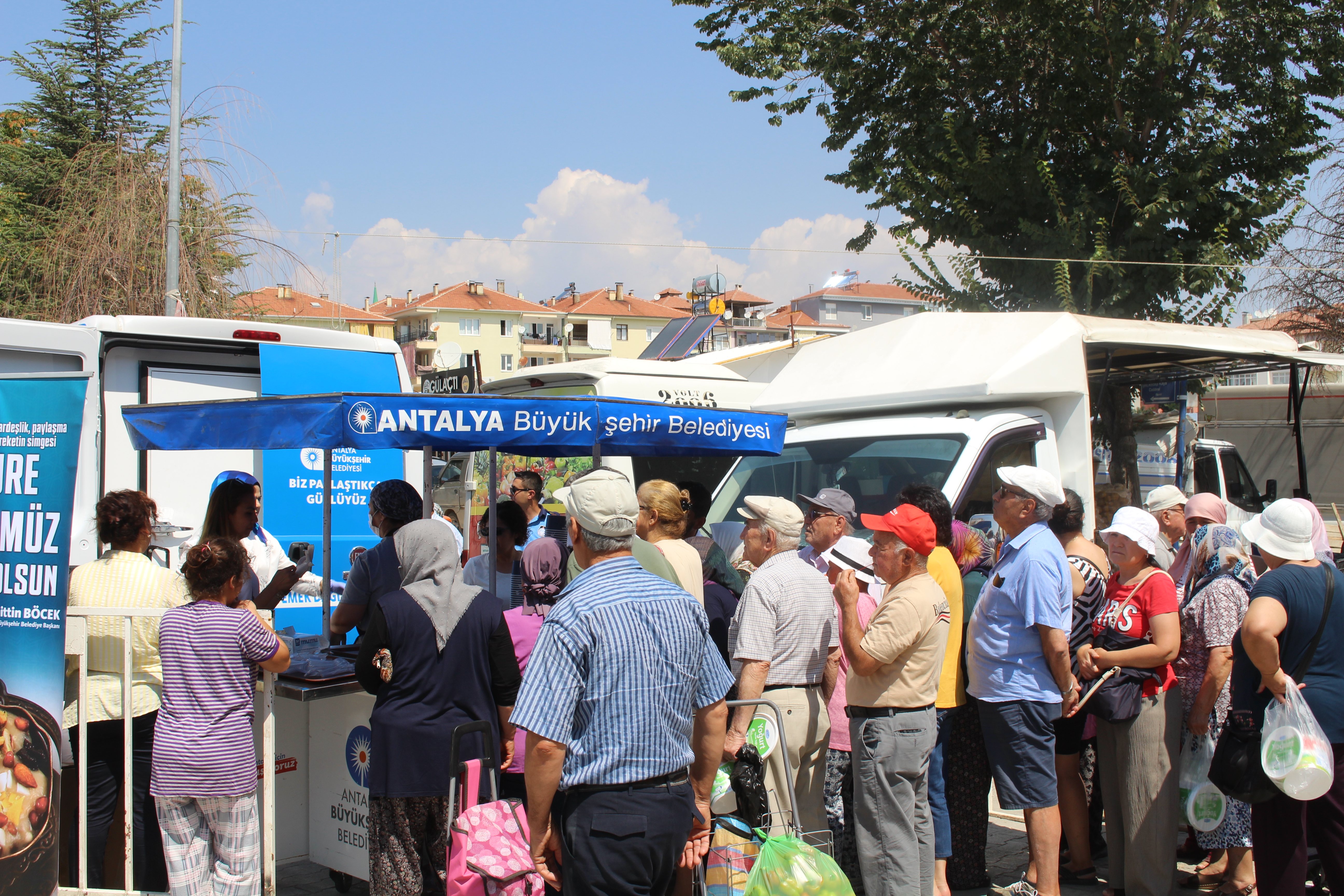 Sosyal Hizmetler Dairesi Başkanlığı’na bağlı Aşevi tırı, son olarak Antalya Büyükşehir Belediyesi önünde aşure dağıttı. Belediye önünde ikram edilen iki bin kişilik aşure kısa zamanda tükendi. İlçelerde de aşure etkinliğini sürdüren Büyükşehir Belediyesi, Kemer ve Korkuteli ilçelerinde de vatandaşlara aşure ikramında bulundu. Korkuteli Belediye Başkanı Saniye Caran kazanın başına geçerek, vatandaşlara aşure dağıttı. Vatandaşlar, Büyükşehir Belediyesi’ne aşure ikramlarından dolayı teşekkür etti.