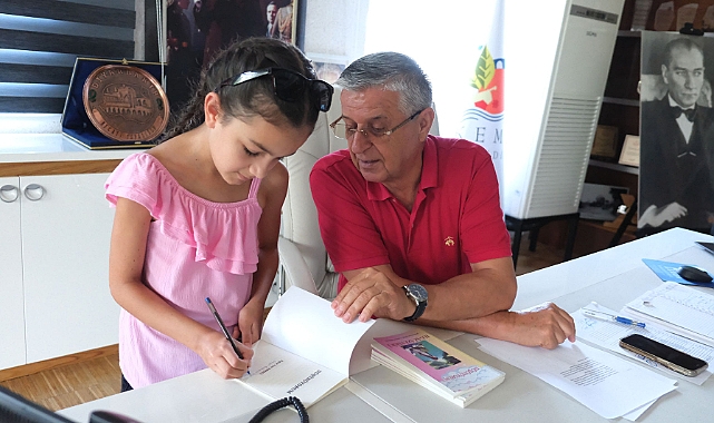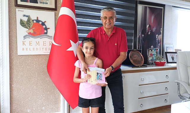 Göynük Ortaokulu 6. sınıf öğrencisi Ilgaz Aze Eskici, yazdığı kitabı Kemer Belediye Başkanı Necati Topaloğlu’na hediye etti.