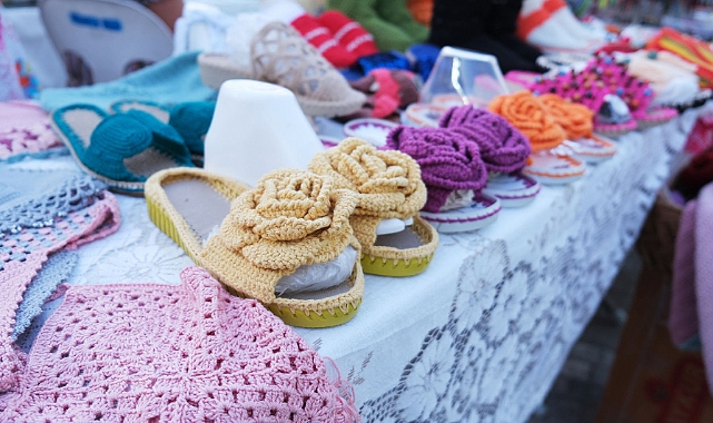 Kermeste Kemerli kadınların sergilediği el emeği göz nuru ürünleri inceleyen Başkan