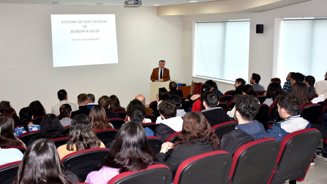 Açılışın ardından “Atatürk’ün Yurt Gezileri ve Burdur’a Gelişi” konulu konferansa geçildi. Tarih Bölüm Başkanı Prof. Dr. Hasan Babacan’ın konuşmacı olarak katıldığı konferansta Atatürk’ün yaptığı gezilerin amaçlarına değinildi. Prof. Dr. HasanBabacan konuşmasında “Bizim toplumumuz, Türk insanı, kendisine yeni ufuklar çizen insanlarahem maddi hem de manevi karşılığı olan ‘Gazi’ unvanını vermiştir. Dikkat edelim devlet kurucularımızdan birisi Osmanlı Devleti’nde Osmangazi. Osman Bey veya Orhan Bey kendi kendine bana bundan sonra gazi deyin dememiştir. Bunu toplum demiştir.Mustafa Kemal'e de milli mücadele döneminde ve sonrasında toplum tarafından Gazi Paşaunvanı verilmiştir. Gazi Paşa Mustafa Kemal de toplumunu tanıyordu, insanları tanıyordu ve onlarla neler yapılabileceğini iyi görüyordu.Bunun üzerine de milli mücadelenin hemen ardından çeşitli yurt gezileri düzenlemiştir. Ve bu yurt gezilerinin amaçlarından birisi toplumla iç içe olmak, onlarla kaynaşmaktır. Atatürk’üfarklı kılan, halkla iç içe olması ve sürekli halktan ileri gelenlerle fikir alışverişinde bulunması ve toplumla tek vücut olmasıdır. Yani halktan kopuk birisi değildir. Gezilerinin bir diğer amacı da o güne kadar yapılan devrimleri halka anlatmak, benimsetmekti. Gittiği yerlerde daha çok gençlerle, çocuklarla içli dışlı olarak bu duygu ve düşüncelerini onlara aktarmıştır. Çünkü gelecek onlardadır diye düşünüyordu. Amaçlarına baktığımızda Mustafa Kemal bir eylem adamıydı. Çıkarılan kanunları yapılan yenilikleri, devrimleri ve bunların nasıl uygulandığını görmek amacıyla da gezilere çıkmış ve bu uygulamaları insanlara anlatmış, uğradığı köy, kasaba ve şehirlerde milletle tek yürek olmuştur.” ifadelerini kullandı.