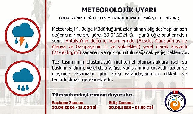 Yapılan son değerlendirmelere göre; 30.04.2024 Salı günü öğle saatlerinden sonra Antalya’nın doğu iç kesimlerinde (Akseki, Gündoğmuş ile Alanya ve Gazipaşa’nın iç ve yüksekleri) yerel olarak kuvvetli (21-50 kg/m2) sağanak ve gök gürültülü sağanak yağış beklendiğinden sel, su baskını, yıldırım, yerel dolu yağışı, yağış anında kuvvetli rüzgar ve ulaşımda aksamalar gibi olumsuzluklara karşı dikkatli ve tedbirli olunması gerekmektedir.