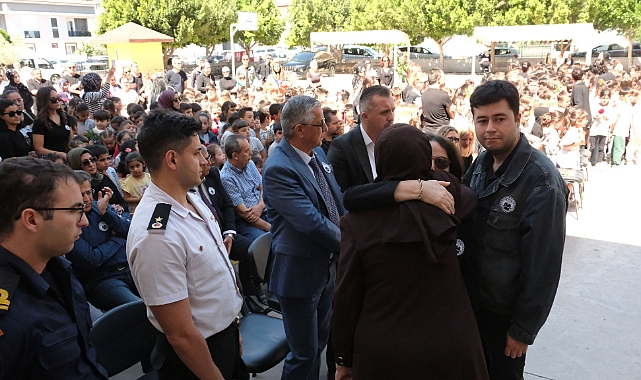 Okulda düzenlenen anma törenine, Kemer Kaymakamı Ahmet Solmaz, Kemer Belediye Başkanı Necati Topaloğlu, Kemer Jandarma Komutanı Ömer Seyhan, Kemer Belediyesi Meclis Üyesi Semih Top, Kemer İlçe Milli Eğitim Müdürü Semra Bekar, merhum Erhan Şahin’in ailesi ve sevenleri, öğretmenler ve öğrenciler katıldı.Saygı duruşunda bulunulmasının ardından İstiklal Marşı’nın okunmasıyla başlayan törende, öğretmenler ve yakın arkadaşları anma konuşması yaptı. Konuşmalar sırasında öğretmenler ve bazı öğrenciler göz yaşlarını tutamadı.Kaymakam Ahmet Solmaz, anma töreninde yaptığı konuşmasında, eğitim camiasına baş sağlığı dileklerini ilettiğini söyledi.Duyguları anlatmanın biraz zor olduğunu ifade eden Kaymakam Solmaz, “Ölüm hasreti bitmeyen bir duygu. Bu hasret insan öldükten sonra bitiyor. İyi bir insan vefat ettikten sonra en küçüğünden en yaşlısına kadar içi sızlıyorsa ve arkasından dua ediyorsa onun için kazanım var demektir. Merhum Erkan Şahin hocamızın yaptığı meslek çok değerli meslektir. Kendisiyle yaklaşık bir yıldır beraber çalışıyoruz. Kendisiyle en son 23 Nisan Ulusal Egemenlik ve Çocuk Bayramı’nda görüşmüştük. İnsan nasıl yaşarsa öyle ölür. Kendisi öğretmenlik için yaşadı ki eğitim yolunda vefat etti. Eğitim camiamızın başı sağ olsun. Kendisini rahmetle anıyorum.” dedi.Kemer Belediye Başkanı Necati Topaloğlu ise merhum öğretmen Erkan Şahin’in kendisini her zaman güler yüzle karşıladığını hatırlatarak, “Okulun bir ihtiyacı olduğu zaman ‘Başkanım bunu ne yapacağız? Okulu siz yaptırdınız. Okulda bir şey bozuk olsa sevinir misiniz?’ diye sorardı. Beni boş tarafımdan yakalardı. Kendisi tam benim istediğim bir öğretmendi. Her zaman güler yüzlü biriydi. Gülen bir yüze kimse tüküremez. Mekanı cennet olsun. Hepimizin başı sağ olsun. Mesleğini en iyi şekilde yapan bir öğretmendi. Kendisi hakkında bu şekilde konuşma yapmak hiç aklımıza gelmezdi. Ruhu şad olsun.” diye konuştu.İlçe Milli Eğitim Müdürü Semra Bekar ise merhum Erkan Şahin’i en son okulda gördüğünü ifade ederek, “Okulumuza bir hayırsever bağış yapacaktı. O kadar sevinçli ve mutlu olmuştu ki anlatamam. Okulu güzelleştireceğini söylemişti. En son üniversiteye derse gidiyordu. Benden izin istemişti ve diplomayı sizinle paylaşacağım demişti. Çok güzel bir insandı. Böyle anılmak çok güzel. Kıymetli çocuklar onun emanetini devam ettireceğiz ve okulumuzu güzelleştireceğiz. Erkan Şahin her zaman kalbimizde yaşayacak. Ruhu şad olsun.” ifadelerini kullandı.Anma töreninde öğretmenler ve arkadaşları Erkan Şahin için çiçek bıraktı. Öğrencilerin okul müdürleri için yaptığı resimler ve yazdıkları duygu dolu notlar da okul önünde sergilendi.